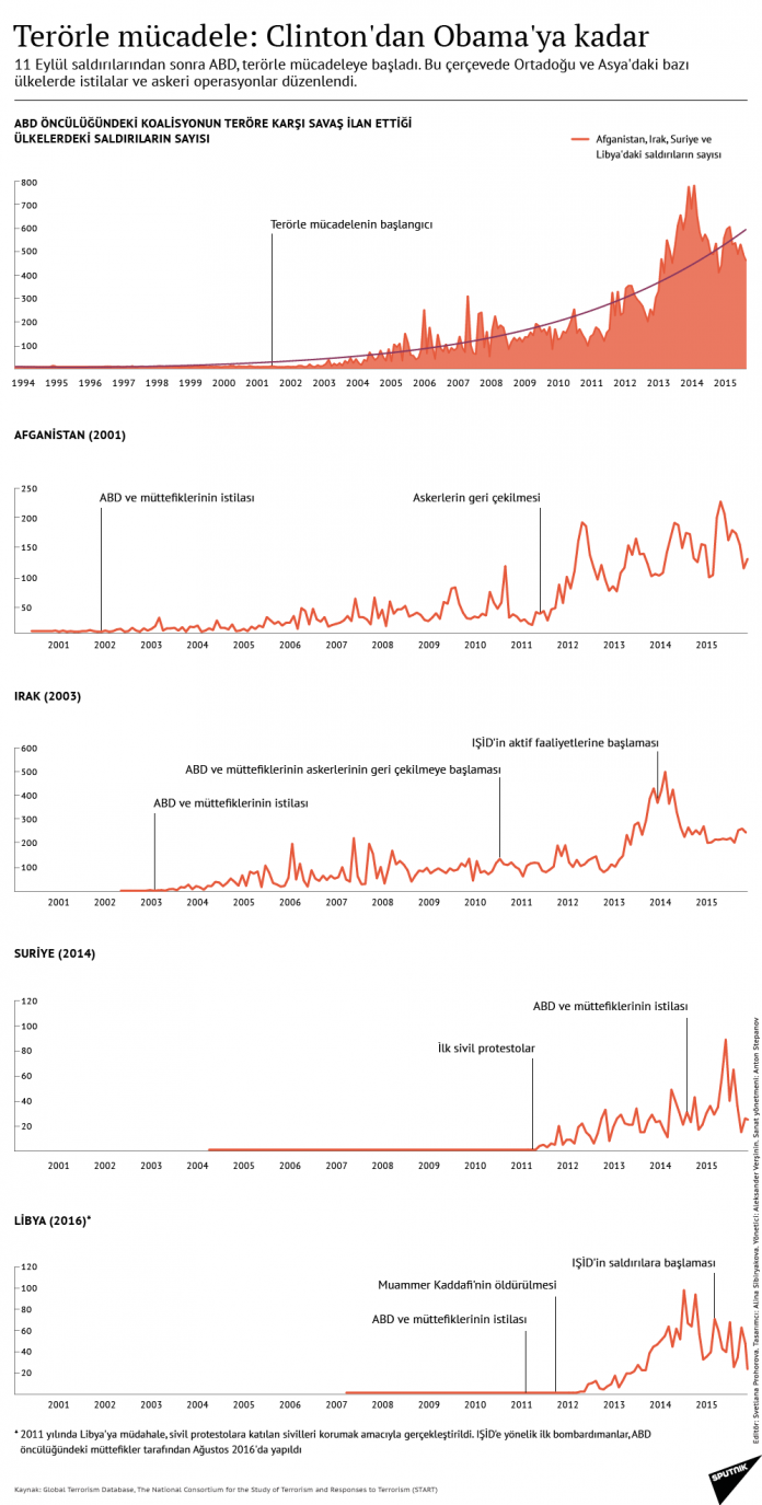 11 Eylül saldırılarından sonra ABD ‘terörle mücadele operasyonlarına başladı. Bu çerçevede Ortadoğu ve Asya’daki bazı ülkelerde istilalar ve askeri operasyonlar düzenledi. Afganistan, Irak, Suriye ve Libya‘da ABD’nin düzenlediği saldırılara dikkat çekilen infografik, ABD’nin Clinton’dan Obama’ya kadar olan dönemi kapsıyor.