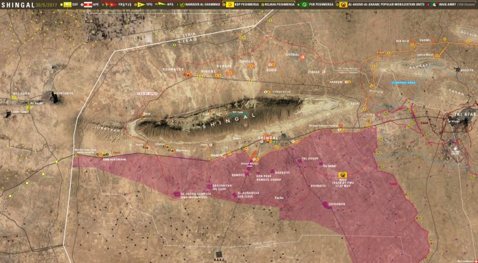 Irak’ın batısında Sincar Dağı ve çevresinde PKK, peşmerge ve Şii Haşdi Şabi milisleri bulunurken, Irak güvenlik güçleri 4 yıl sonra ilk kez (kuzeyden) Suriye sınırına ulaştı. Irak halkı tarafından coşkuyla kutlanan bu operasyon sonrası Irak güvenlik güçleri 17 km2’lik alanda kontrol sağladı. (pembe olarak gösterilmiş) Sincar Dağı’nın güneyinde bazı bölgeleri IŞİD’den geri alan Irak güçlerinin ilerleyişinin süreceği belirtiliyor.