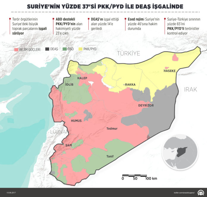 Suriye’de iç savaş 7. yılına girdi. Fakat ülke topraklarının %37 hala terör örgütleri DEAŞ ve PYD kontrolünde. Yaklaşık 185 bin km²’lik bir alana tekabül eden bu bölgenin büyük bir kısmı ABD destekli PYD terör örgütünün elinde.