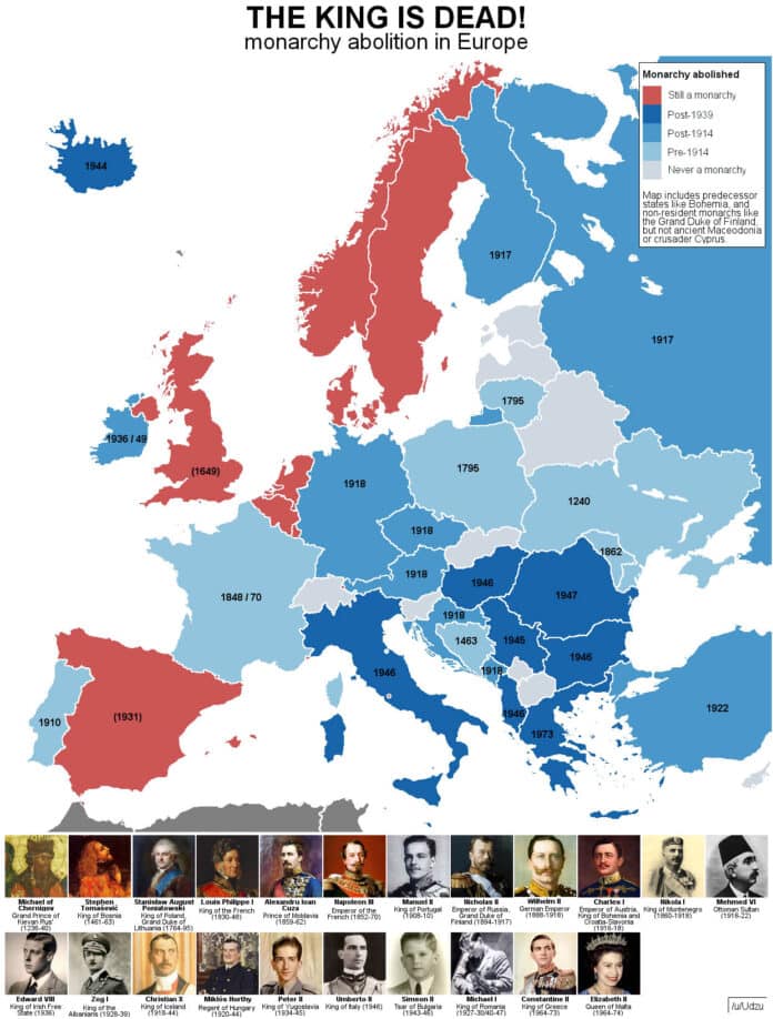 Avrupa Ülkelerinde Monarşi Ne Zaman Kalktı? Yazar Editör - 2 Mayıs 2023 713 FacebookTwitterPinterestWhatsApp Avrupa’da tek adam yönetimi monarşilerin sona erdiği yılların haritası. Yunanistan’daki cuntacı 2. Constantine’den Loan Cuza’ya… Lider fotoğrafları ve belirli yıllar arasında da olsa ülkelerdeki monarşi yönetimlerinin dönemleri: STRATEJİK ORTAK E-DERGİ