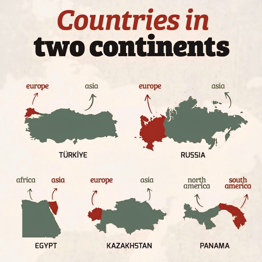 Bu görsel, iki kıtada birden yer alan ülkeleri gösteriyor. Genel olarak doğru bilgiler içerse de, bazı kıta sınırları tartışmalı olduğu için kısa bir açıklama yapmak gerekir.