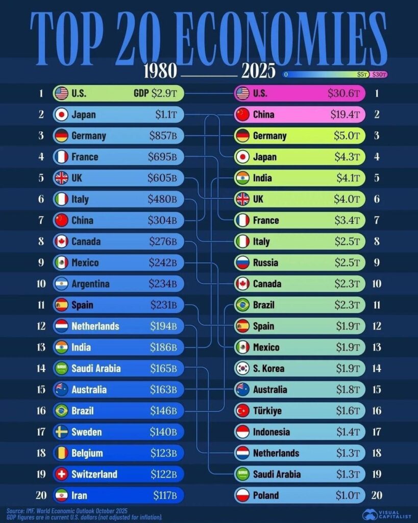 1980 ile 2025 yılları arasındaki 45 yıllık süreç, küresel ekonomik dengelerin köklü biçimde değiştiğini açıkça gösteriyor. 1980’de dünya ekonomisine ABD, Japonya ve Batı Avrupa ülkeleri yön verirken; 2025’e gelindiğinde Çin ve Hindistan gibi Asya ekonomileri küresel sıralamada üst sıralara yükseldi. Aynı dönemde bazı ülkeler ilk 20 listesinden tamamen çıkarken, bazıları ise büyük bir sıçrama yaparak küresel ekonomide daha güçlü bir konuma ulaştı.