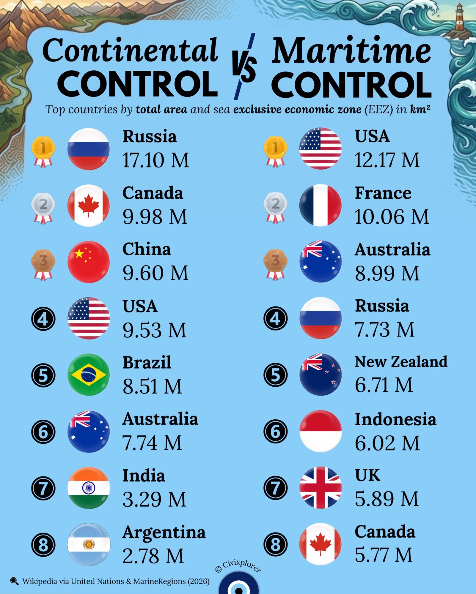Dünyanın En Büyük Ülkeleri: Kara (sol) ve Deniz (sağ) Yüzölçümü: