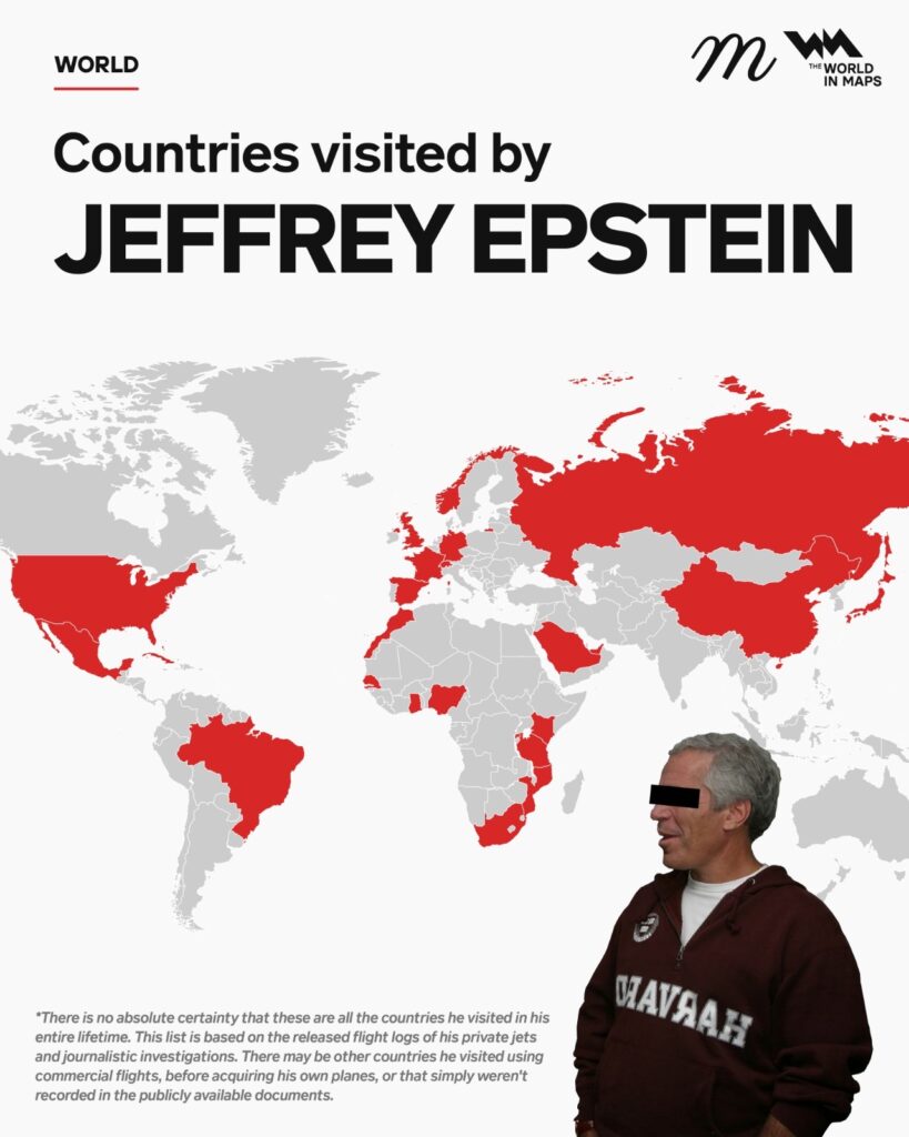 Jeffrey Epstein’ın ziyaret ettiği tüm ülkeler de şu şekilde:
